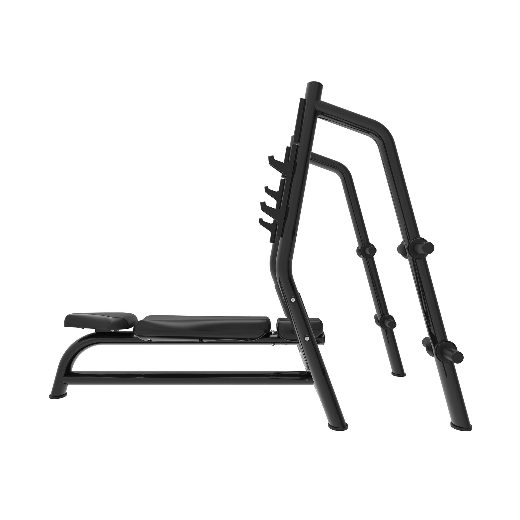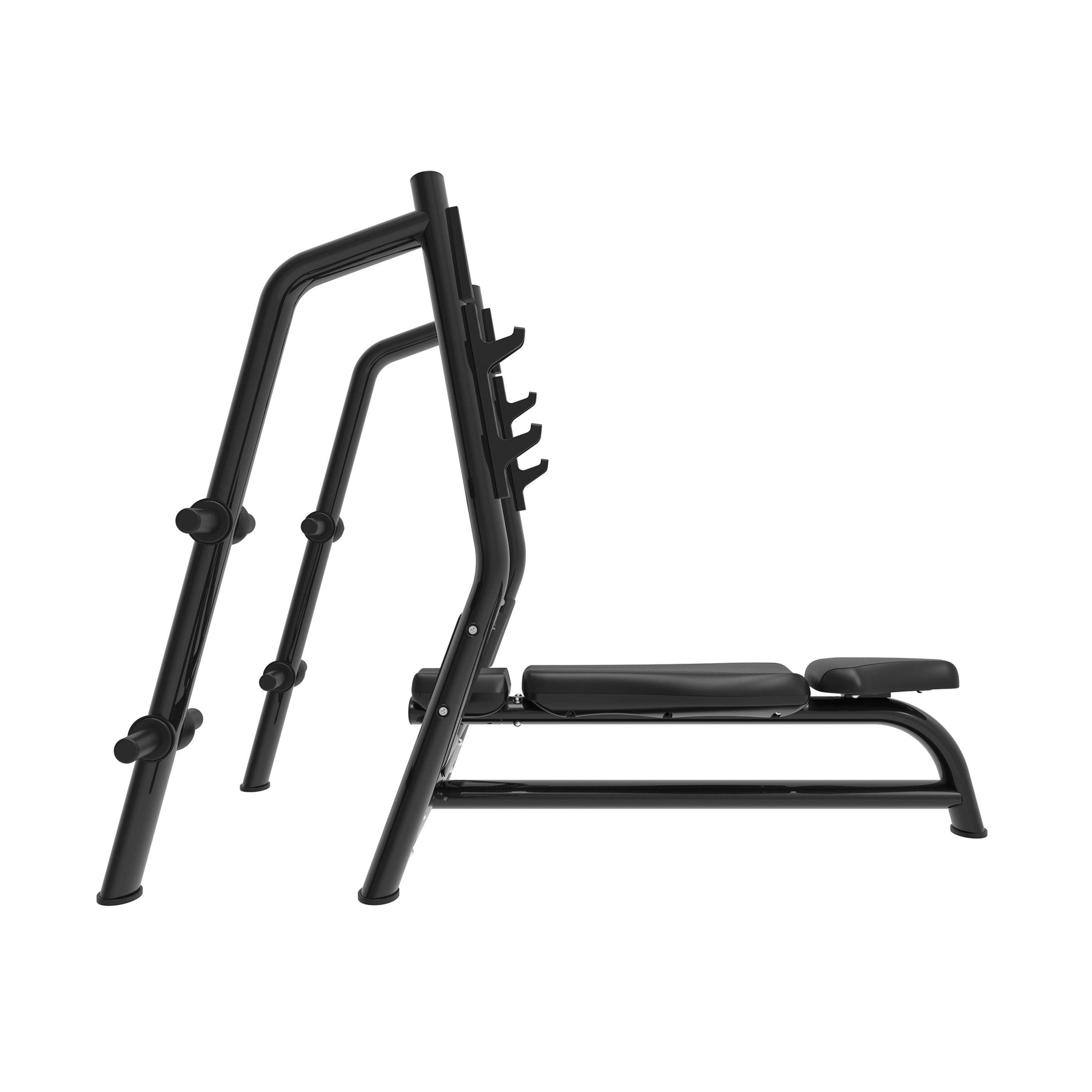 The bench features a completely flat surface and high-density padding that provides firmness and comfort, allowing you to maintain a technical and stable posture throughout the movement. The bar supports, arranged at different heights, facilitate a comfortable lift-off and a secure re-rack, adapting to the type of training or the user's height. The open front area allows for spotter assistance, making intensive workouts safer and more effective.