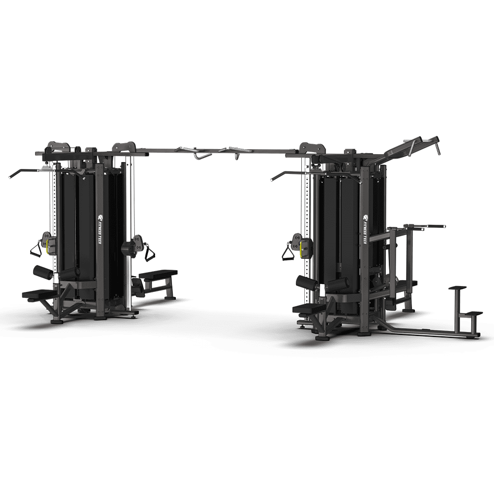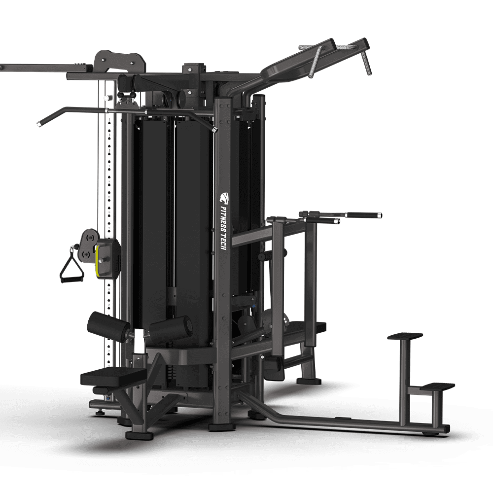 The 8-station multifunctional center from the Pro Series line by Fitness Tech is designed to provide a comprehensive training solution for high-performance professional spaces. This structure integrates multiple workout stations into a single unit, allowing simultaneous strength and functional training with maximum efficiency, optimizing space usage in fitness rooms with high user turnover.